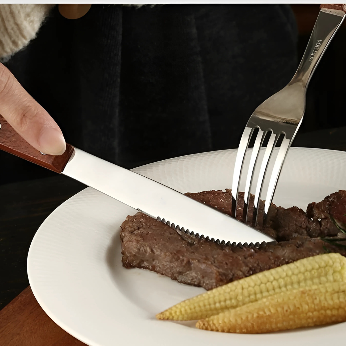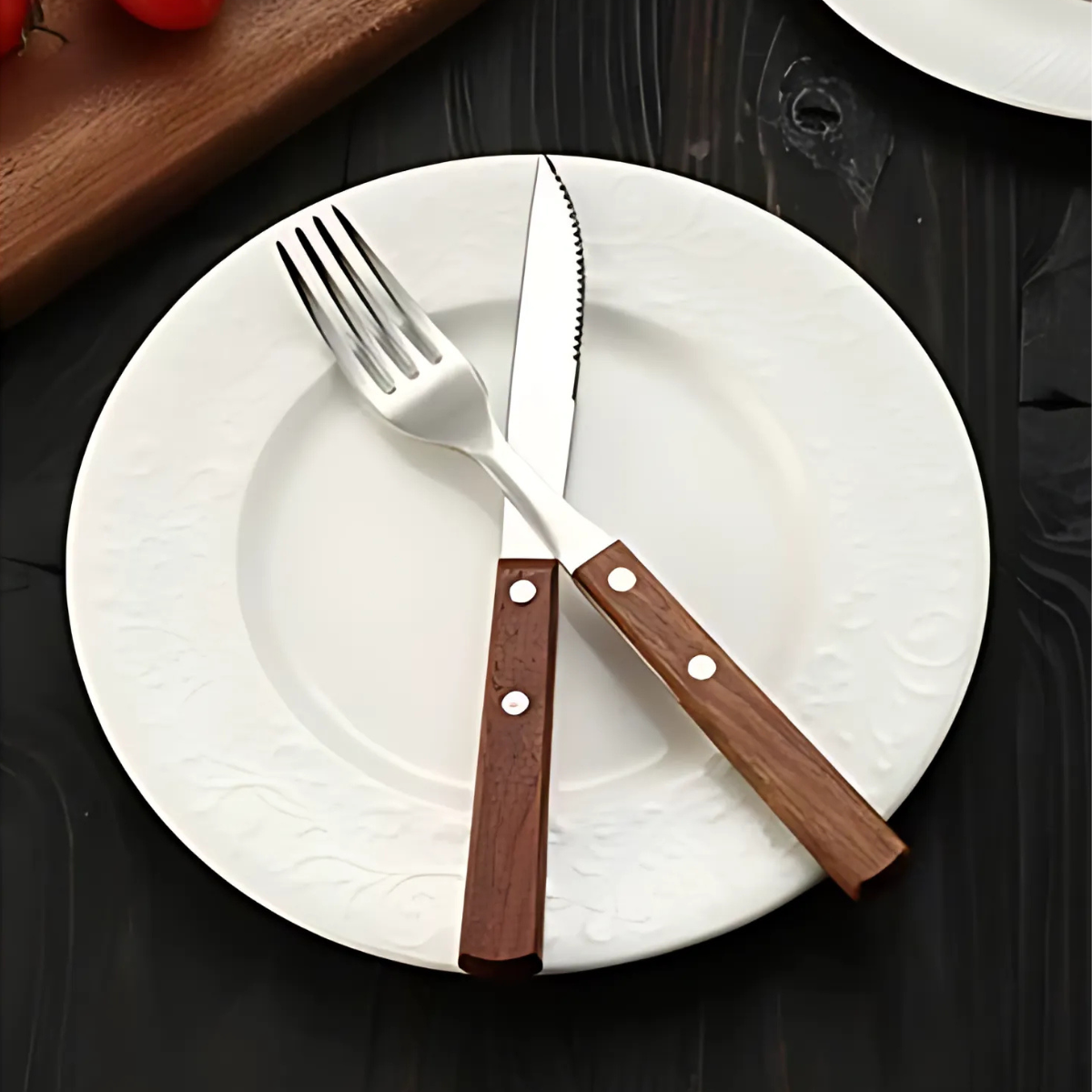 Versatilidade de Estilos: O contraste entre o metal brilhante e a madeira natural faz com que este jogo de talheres combine tanto com mesas clássicas e toalhas de linho, quanto com ambientes descontraídos de área gourmet e churrasqueira.